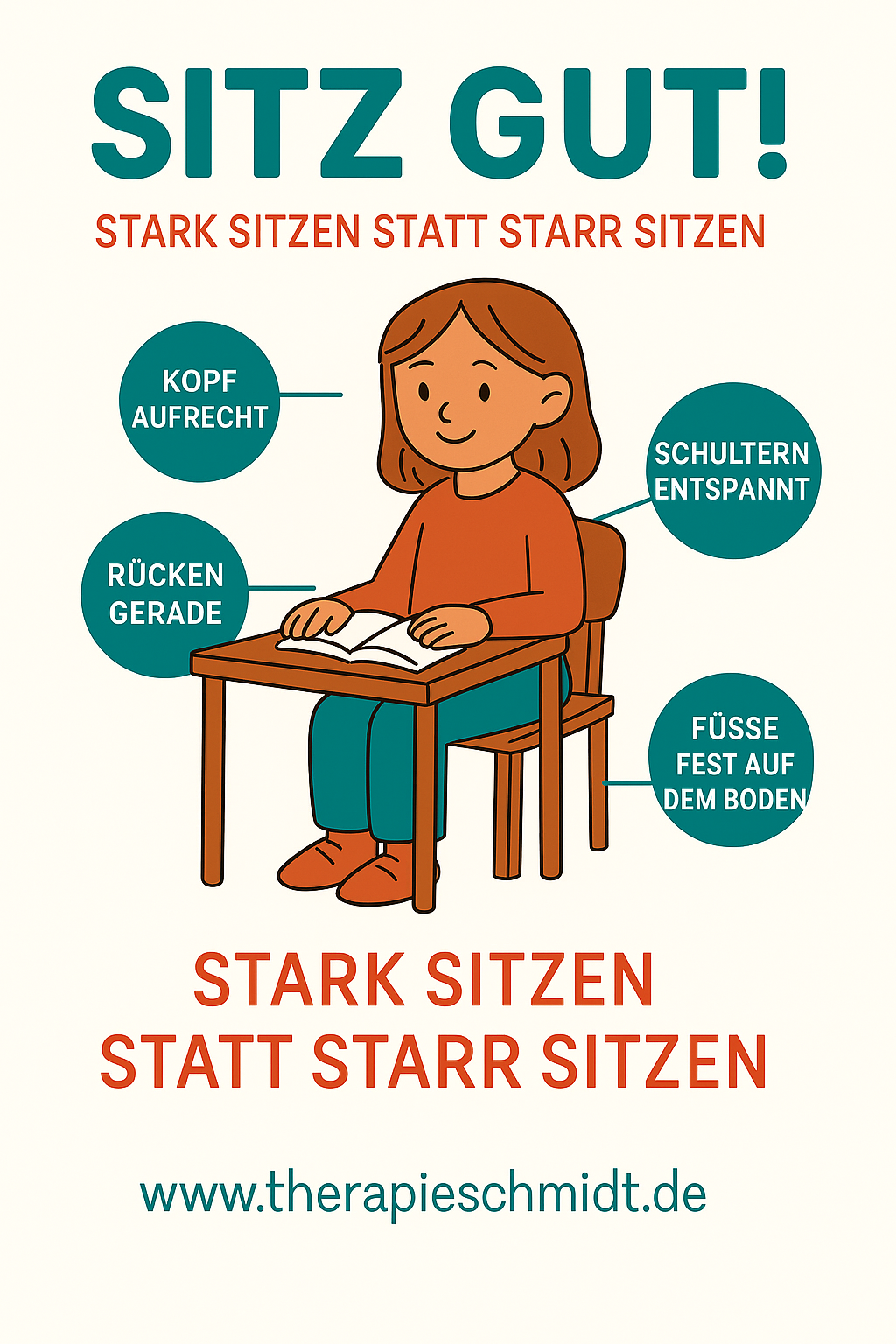 Ein kleines Poster für Kinder, das mit liebevollen Figuren zeigt, wie eine gesunde Sitzhaltung aussehen kann – mit dem Motto: „Stark sitzen statt starr sitzen!“